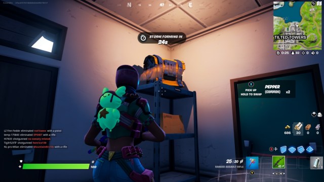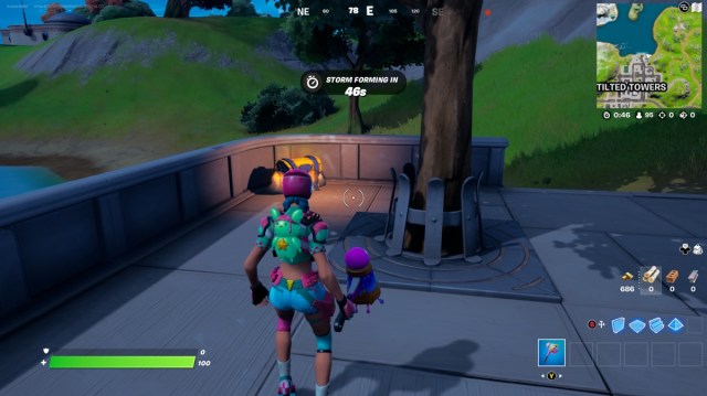 Finally, two bonus chests sometimes spawn beneath the metal steps that lead up to Tilted Towers, just before the cafe. This is also a great spot for a quick getaway on a boat, and an area where you could spot a Klombo!