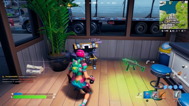Drop into the northeast of Tilted to find a cafe building with trees and a truck nearby. This spot has the possibility of five chests within a few meters! Remember: chest, ammo box, and freezer spawns are random and may not be the same in every match. The first chest is in the cafe by the door.