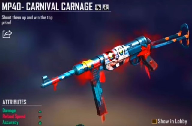 When using the MP40 Carnival Carnage, your favorite SMG will have increased accuracy and damage at the slightly expense of reload speed.