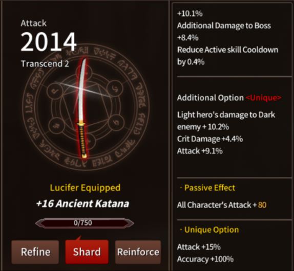 The Ancient Katana is a fairly simple weapon (for a 5* weapon at least) but it has some pretty cool stats, which work great for damage dealers or support characters. Try to look for skills that you need on your team, ideally damage to the boss, damage to normal monsters, flat ATK, or ATK %. You can also try to tailor it to a specific character by rerolling for elemental stats for that hero.