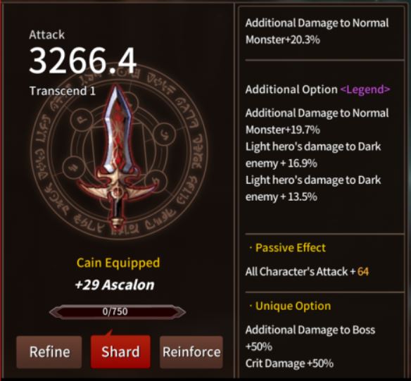 You want Ascalon tailored for Cain (or for your second damage dealer) because it’s a great weapon that works wonders against bosses. As for the stats (Option/Additional Option) you want to look either for flat damage (ATK), damage to bosses, damage to normal monsters, or elemental damage type according to the hero (as shown in the image).