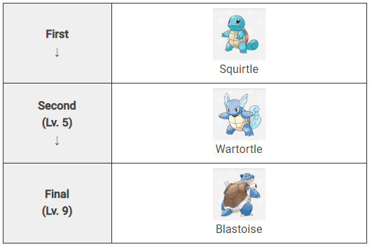 Blastoise begins as Squirtle at level 1 and then evolves into Wartortle at level 5. Finally, the Pokemon turns into Blastoise at level 9.