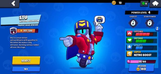 Although his super appears weak on paper due to its short range, his strength comes from his quick charge. If Stu hits a player with both his super and attack simultaneously, his super is recharged, allowing him to perform chains of dashes on his opponents.