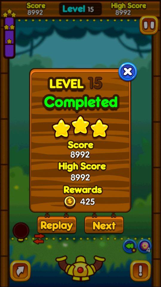 The game also comes with bonuses. These bonuses can help the more challenging levels where the line gets closer to you, each shot’s accuracy is key at this point. Thankfully, those bonuses can add an edge to your game. Honestly, they aren’t really needed here, as usually you will find yourself never too challenged unless you the player makes a fatal flaw in bubble positioning. Think of it like a lifeline on Who Wants To Be A Millionaire but in this case, the questions are as easy as, “What’s two plus two?”.