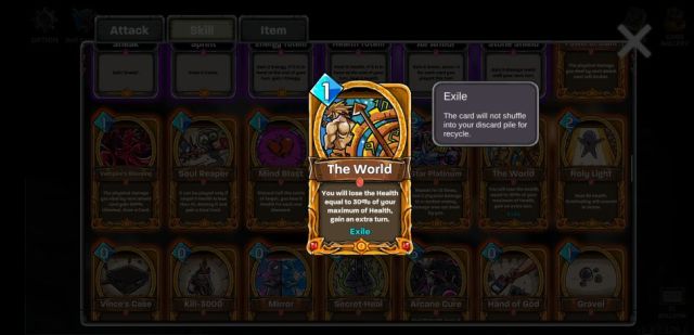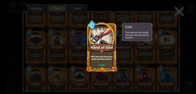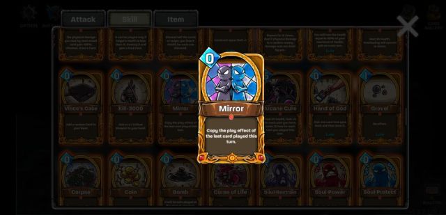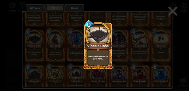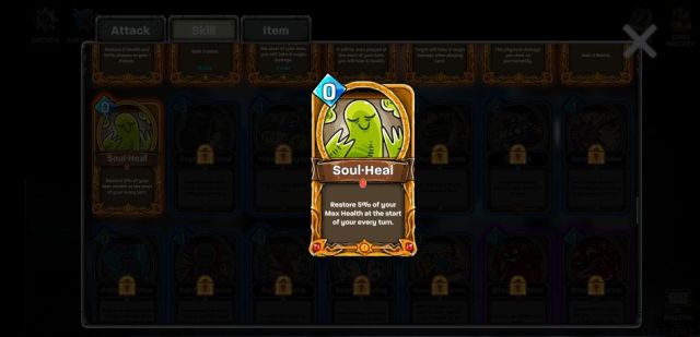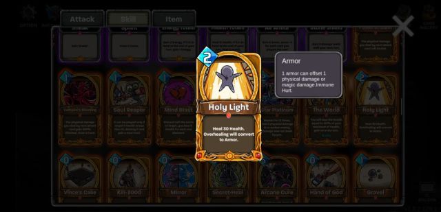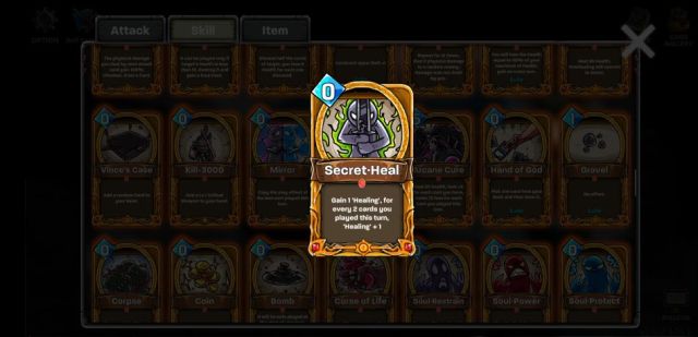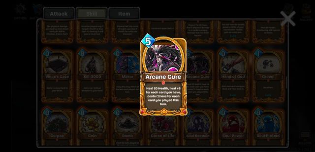 – Heal 20 health, heal +5 for each card you have, costs (1) less for each card you played this turn