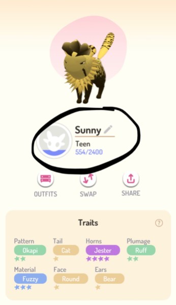 To change the name just tap on the Dot icon on the bottom left of your screen. This will take you to all of your pet’s information including its image, outfits, traits, personality, and any tricks you have taught it, among more. All of these things should help you decide on what name you will give it. Next to its current name will be a pencil icon to tap which brings up a box to enter its new name.