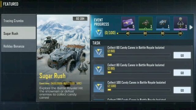 As mentioned earlier, Activision has also launched various new events to celebrate the Winter Festival. One such event is Sugar Rush that is available under the featured tab. In order to complete this event, players must collect Candy Canes in Battle Royale Isolated mode.