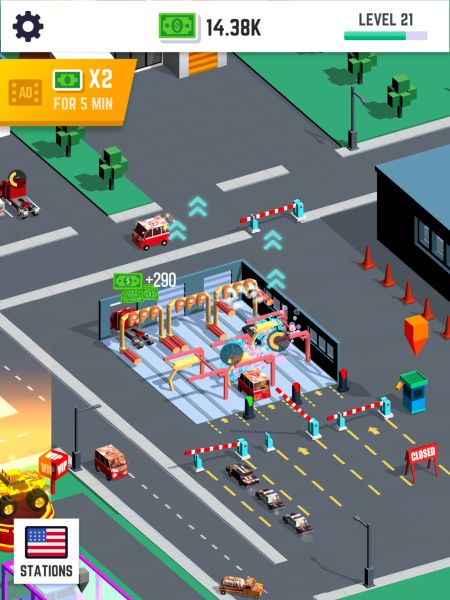Tyre Shop: Unlocks at level 15, but gives a lot more money per car ($100 at first level). It’s slower and for a while just one car can enter, but it’s really worth it. Upgrade this one in order to fill the bar up and allow more cars to get in there.
