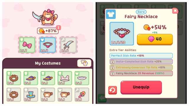Don’t forget to tap on your Costumes section in Cat Snack Bar to see what you have collected and merge any identical items for upgrading. Soon you will be raking in those coins!