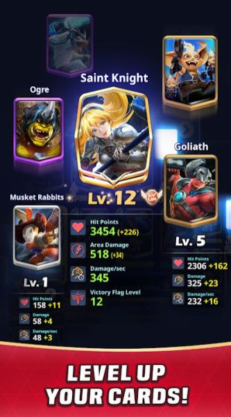 You should always try to make your cards more powerful by upgrading them. In order to upgrade a card, you will need to collect multiple copies of that card, and then use some Gold to make the upgrade.