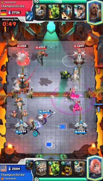 – If players have equal points when the timer ends, the game will go into overtime mode, where a “Sudden Death” mode is activated, and the player who loses either his champion or his tower first will lose.