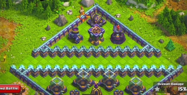 - On top of the base, use Wall Breaker, King, Grand Warden, and your Recall Spells. After that, a little to the left, place the Wizard and another Wall Breaker near the Monoliths. Then, use the King’s Ability and the Skeleton Spell on the monoliths. And don’t forget to use the Warden’s ability.