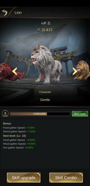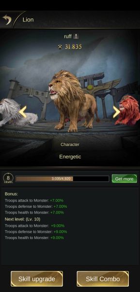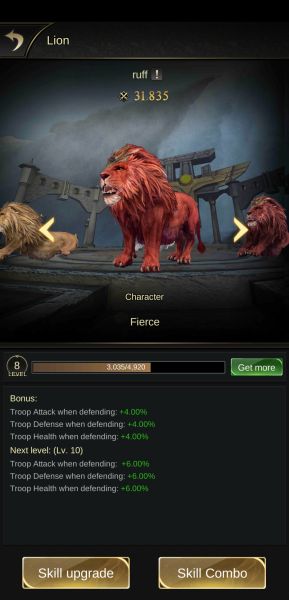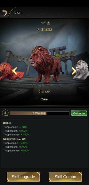 A great Lion for when you head on to the World Map and got your eyes on another player’s Empire is this Cruel Lion. It will increase your troops’ stats overall and will benefit your whole army when making direct attacks and marching towards the enemy.