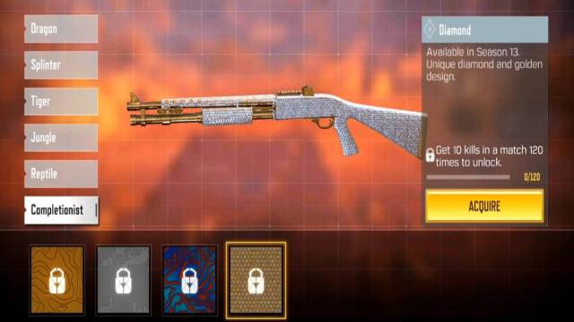 For example, if you want to unlock Sniper Rifle Diamond Camo, you must kill 10 enemies per match 120 times (1200 in total). Right now, a total of 7 Snipers are available in the game, and to unlock Diamond Camo for each Sniper Rifle, you need to get 8400 kills in total.