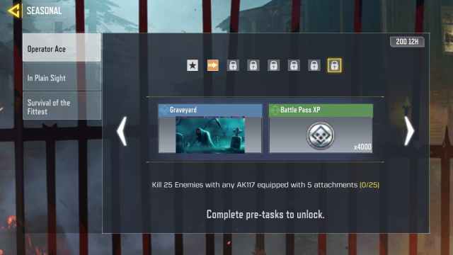 - Kill 25 enemies with any AK117 equipped with 5 attachments. (Graveyard Card and Battle Pass XP x3000)