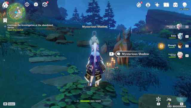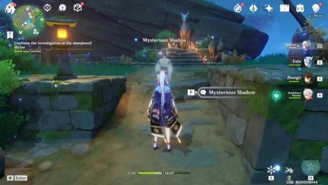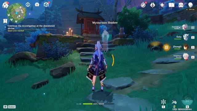 When players arrive at the Abandoned Shrine near Chinju Forest to carry out the investigation, they will find a Mysterious Shadow – she is a ghost, you heard us right. To complete “Continue the Investigation at the Abandoned Shrine” players have to find and interact with three Mysterious Shadows to move them in the central area.