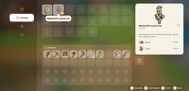 After that, click on the Makeshift Scarecrow; granted, you have everything ready, the crafting process will take no time, and you will have your Makeshift Scarecrow prepared to place anywhere on your Farm to make sure no bird destroys your crops.
