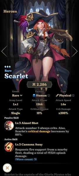 Scarlet is one of the best heroes you can use in Defense Derby, and she is available for free to everyone. Scarlet is a Rare single-target Human hero whose passive skill buffs critical damage and guarantees a critical shot every few seconds. You can also use her active skill to deal significant AOE damage.