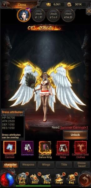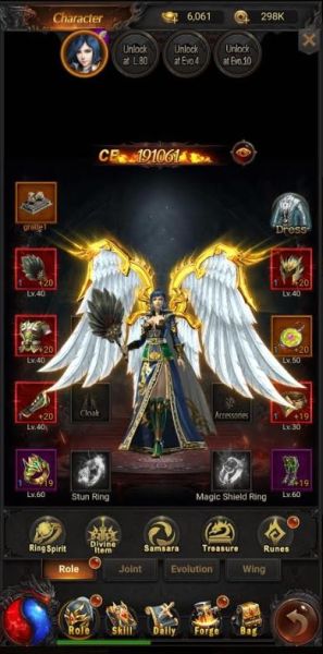 – Role -> Wing – the wing will be unlocked after you have leveled up quite a bit, and this will also increase your stats by quite a lot. You will need Feathers to upgrade the wings, and with each upgrade they will grant better stats. After you’ve made plenty of upgrades they will change how they look!