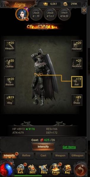 Once you smelted them, you can then head on to the Forge tab and select the Intensify button which will let you smelt all of the gears that you have. This forging process will enhance all of the gears that you are equipping and it will stay that level – so even if you change your equip it will keep the forging level.