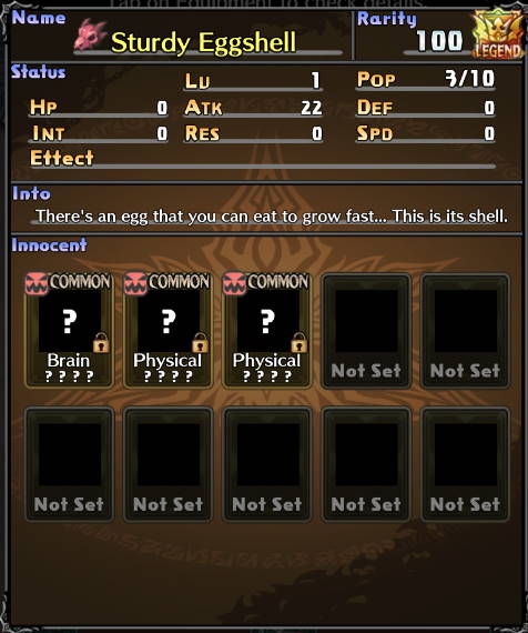 You’ll see that this item has three common rarity Innocents hiding within. Innocents have rarity levels (common, rare, legendary) just like equipment, which determines how strong their attribute modifier is.
