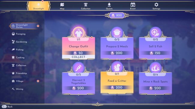 It is simple! Go to the pause menu by pressing the ESC key or the respective key, assuming you are playing the game on consoles. In the pause menu, under Dreamlight, you will find Dreamlight Duties—check the tasks; it simply involves changing outfits, taking pictures, preparing meals, mining four rock spots, and such activities. Complete the Dreamlight Duties and click on them to collect Dreamlight as a reward.