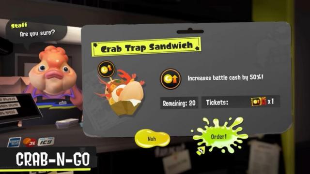 Hungry Inklings and Octolings looking for a fresh bite to eat can head over to the Crab-N-Go, Splatsville’s most popular food truck. You’ll have to pay tickets to grab a bite, but you’ll be granted special buffs for a set amount of battles.