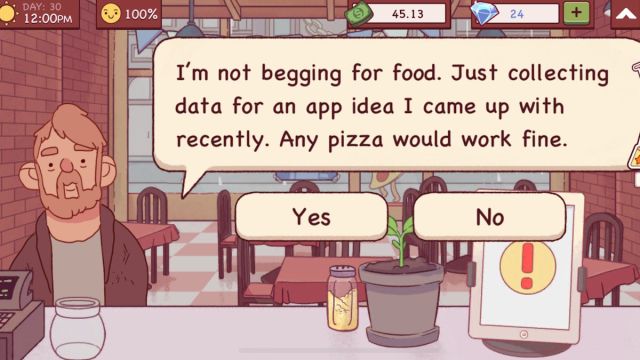 Well, unfortunately, things didn’t work out, as Rufus explains on his next visit. His pizza app is a bust, and he gives you 50 pizza funds back as consolation. You can take the money, or you can let him keep it, giving him more time to figure something out.