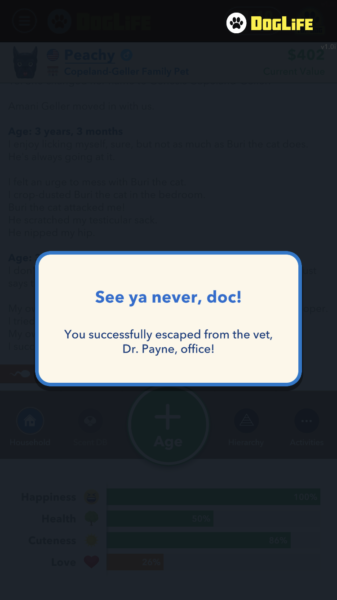 Sometimes you will get sick in DogLife and require medical attention. If you have humans who care for you, they will take you to the vet for treatment. Generally, you will be taken to the vet by a good owner just for a check-up, but you can take steps to increase your chances of being taken there. To be guaranteed a vet visit, you could do a variety of things that may cause you harm, such as: getting into fights, eating garbage, licking or eating things you shouldn’t, or taking drugs left around by humans.