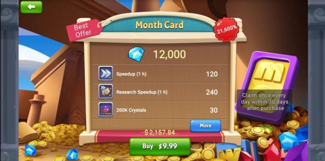 Another pack that I feel is worth mentioning is the Month Card, which will give you a total of 12000 Diamonds, 120h worth of Speedup, 240h worth of Research Speedup, and millions of resources. This offer will allow you to claim goodies once every day within 30 days of purchase, so it is pretty good for $9.99.