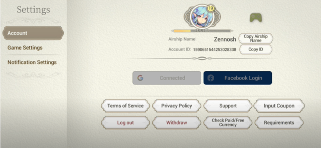 To redeem coupon codes in Exos Heroes players require their airship name. So, go to the in-game settings and copy your airship name. Then tap on “Input Coupon” tab located right next to support tab.