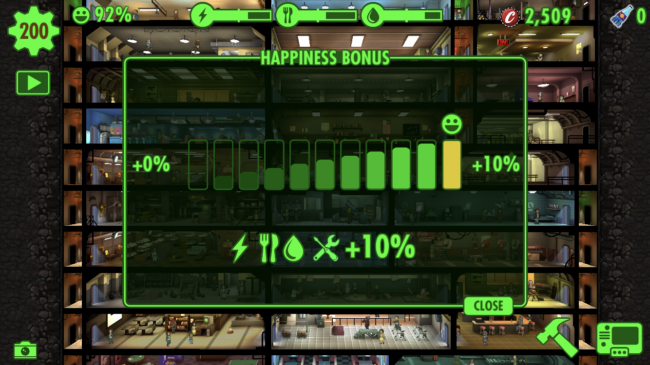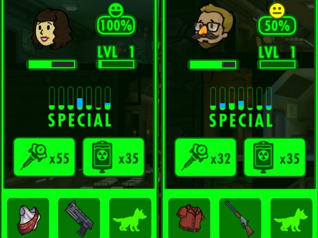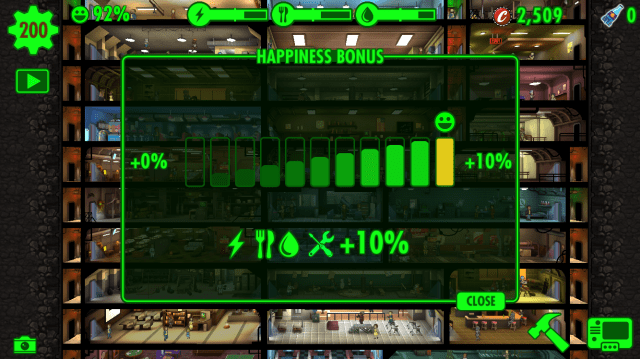 Dwellers’ happiness is indicated by the red/yellow/green face in the top right corner when you tap on them. Dwellers are at their happiest when they are healthy and working somewhere they are strongest in. Each working room has a specific stat assigned to it (Strength, Perception, Endurance, Charisma, Endurance, Agility, Luck) and if your dweller has a high stat specific to that room they will be at their happiest. Keep training your dwellers in each stat and eventually your dwellers will be happy where ever they work.