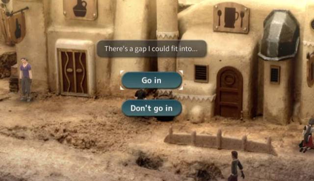 With the bones in hand, go down to En – New District and head to the Starry Eyes bar, but don’t go in. To the left of the bar you should see a crack in between the buildings, so examine it to crawl through.