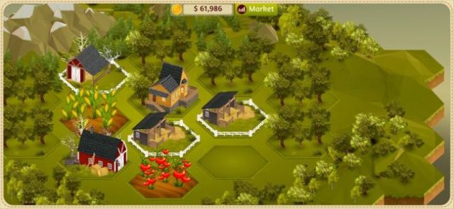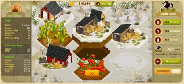 At the barn, you can buy upgrades to increase your harvests. You can purchase harvest machines, tractors, and trucks. Each vehicle adds to your “production points,” and the more points you have, the bigger your harvests will be.