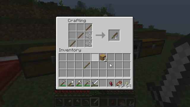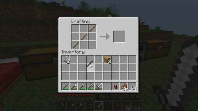 In the next step, open the crafting table and add three sticks exactly as shown in the image above. In the first, second, and third row, place the wooden stick in the third, second, and first slot, respectively.