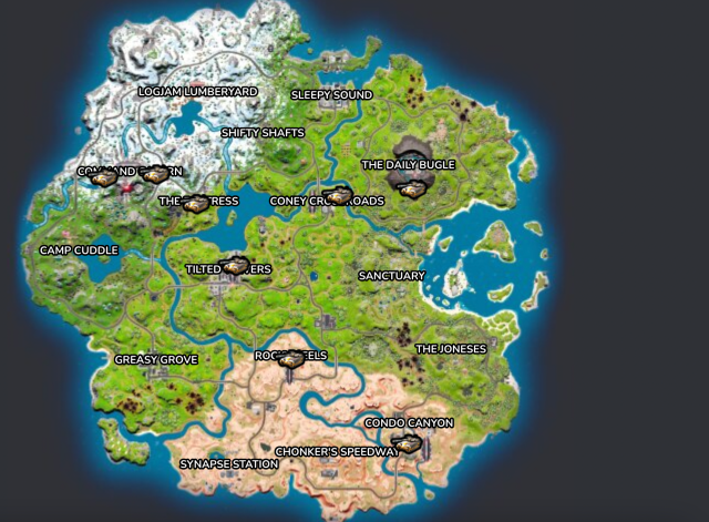 Now, all you need is a tank. The nearest tank spawn location to a Seven outpost is Command Cavern and you can easily drive the tank from there to the Seven Outpost located just west of the location on a remote island separated by water. We have also marked all tank spawn locations in the image below, courtesy of Fortnite.gg: