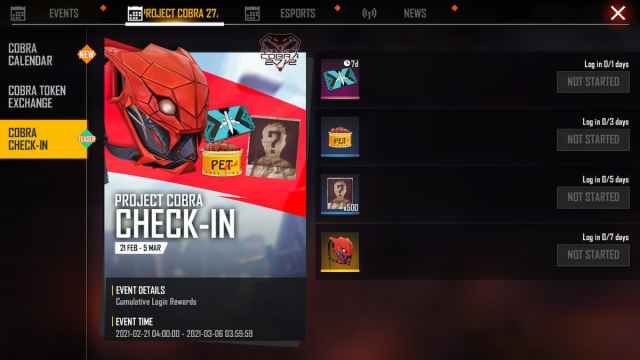 Free Fire’s second event, Cobra Check In Rewards, of the Project Cobra series is live now. The event is rewarding players with many rare rewards including Cobra Backpack skin, free Pet Food, bounty token play cards and more.