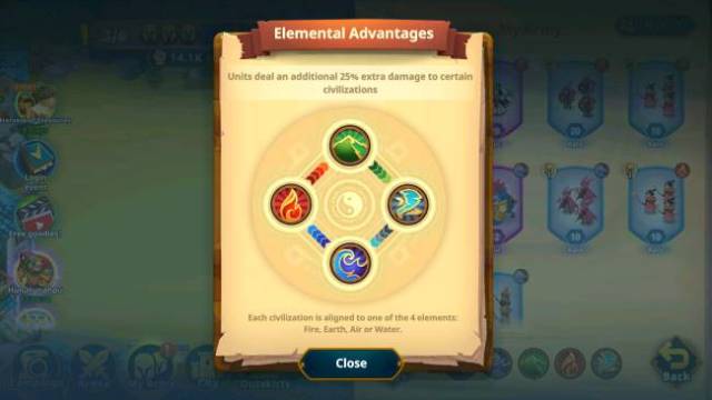 Once you reach the second world, start paying attention to the elemental advantages. Each nation is aligned to one of the four elements: fire, earth, air, and water. Earth beats air, air beats water, water beats fire, and fire beats earth. The unit with the advantageous element will deal 25% bonus damage.
