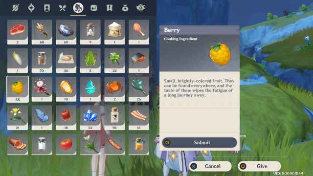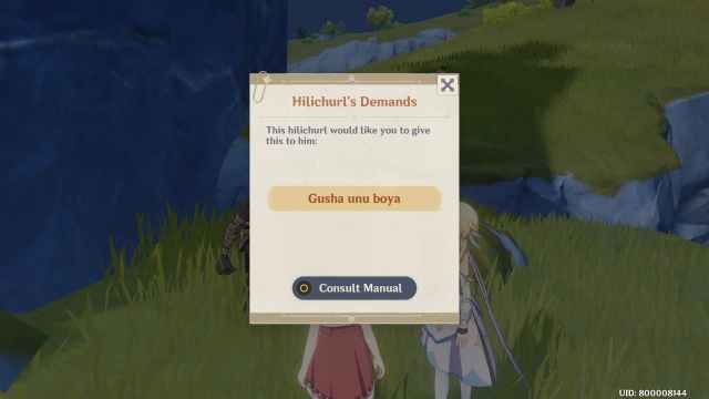 The first Hilichurl is located in the Liyue region. Go to the marked location and talk to the Hilichurl. He will demand you an item called “Gusha unu boya“. Given him a “Berry” to progress through the event quest.