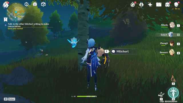 At the start of the sighting 7 quest, players have to travel to the marked location and talk to a Hilichurl. To identify the Hilichurls who are willing to talk – look for the ones who are dancing or doing other unusual activity.