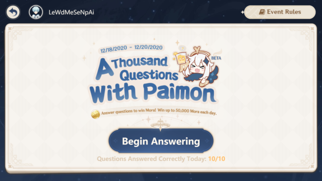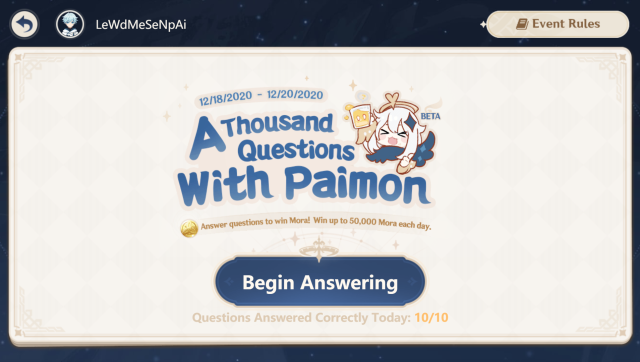 Earlier Today, Genshin Impact commenced one of the last events of update 1.1 called “A Thousand Questions With Paimon“. In this new event, players have to answer 10 questions related to the game. And with each successful answer, the players are rewarded with 5k Mora.