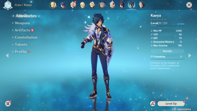 Kaeya is a Cryo user with the sword as a choice of weapon. He is a very useful character in terms of utility. Just like Amber, Kaeya joins the team during the early part of the game, specifically, during the intro quest, Crash Course.