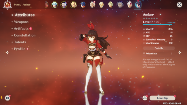 Amber is a pyro user with Bow as a choice of weapon. She is one of the most, if not the most underrated characters in Genshin Impact, despite her endless potential. Amber joins the team, right at the very beginning of the game, during the prologue mission.