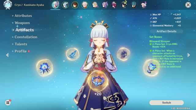 For artifact, there are two options, you can either go for the Blizzard Strayer set to get the Cryo DMG and other bonuses. Or, you can aim to increase the ATK% as much as you can. For that, you need Gladiators’ Finale set or the newly added Shimenawa’s Reminiscence.