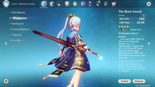 The best budget-friendly weapon option for Ayaka is the black sword. It increases damage dealt by normal and charged attacks – which fits perfectly with Ayaka’s passive. It also helps you to heal Ayaka whilst dealing damage.