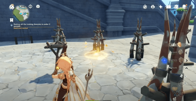 Step 4.) Now use the Travelers Elemental Skill – Starfell Sword on the second dummy. As we know, the Geo element skill – Starfell Sword does an AoE damage, and it will destroy three of the weak dummies. And as soon as you use your ability quickly destroy the two dummies near you.