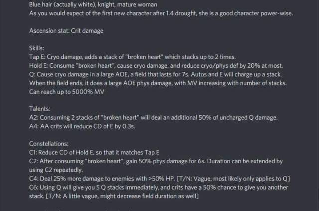 As per the leak, “Eula also known as The Spindrift Knight is a scion of the old aristocracy and the Captain of the Knights of Favonius Reconnaissance Company. The reason for which a descendant of the ancient nobles might join the Knights remains a great mystery in Mondstadt to this very day.”