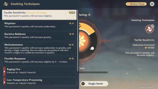 The ideal smelting zone can be checked on the left side of the Smelting tab. Once you use any Smelting Technique, the bar will fill up to a certain limit. Use different combinations of Smelting Techniques to achieve Perfect Quality.