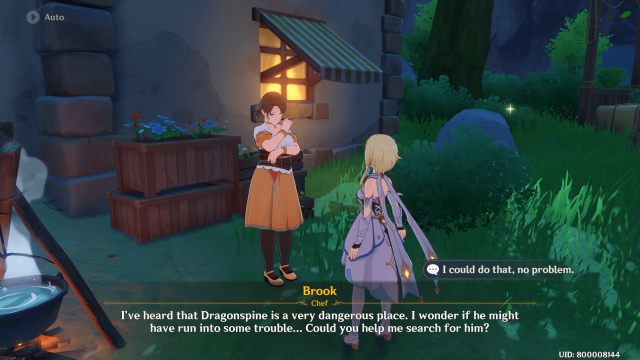 Travel to Springvale teleport waypoint and make your way towards the marked location. There you will find Brook, the same person who you and Xiangling challenged for a cooking competition in one of the story quests.