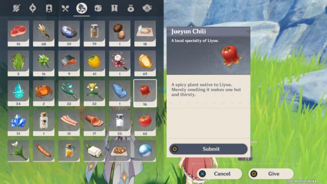 So, players can give Jueyun Chili to the Hilichurl to progress through Mimi Tomo Sighting 4 event quest. Or, you can give other items like Tomato or Carrot.